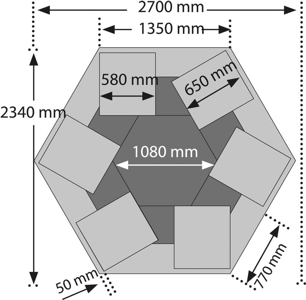 6-Eck-Werkbank, Platte Buche 40 mm, Kantenlänge 1350 mm, 6 Schubladen Höhe 150 mm, 6 Füße höhenverstellbar 840 mm, RAL 7035/5010 EP517217