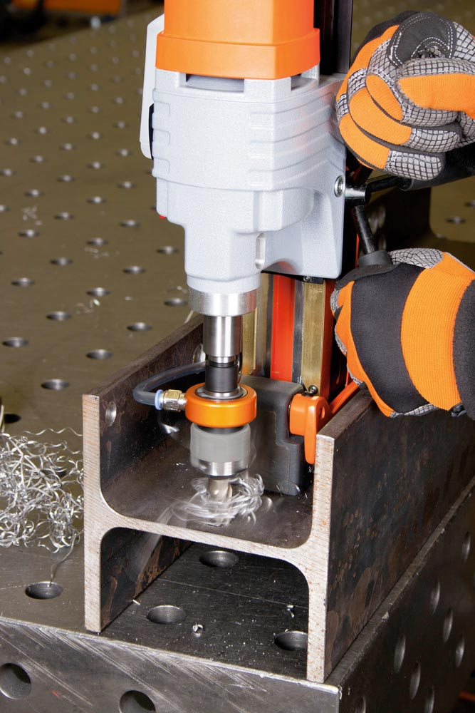 Kernbohrmaschine mit Doppel-Schwalbenschwanz-Schlitten und verstellbarer Antriebseinheit ∙ Magnet - Aktivierungshebel ∙ LED-Haltekraftanzeige ∙ Magnetkraftsensorsensor ∙ Sanftanlauf ∙ Spezialgetriebe ∙ Platine mit Hybridrelais ∙ TiN-beschichtete - Magnetunterfläche ∙ Folientastatur ∙ haftet ab 3 mm Materialstärke