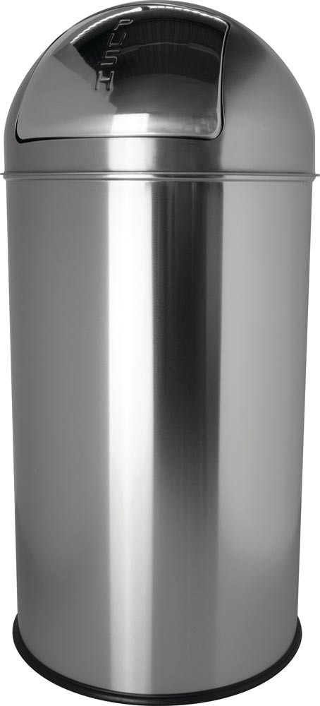 Rumpf und Haube aus pulverbeschichtetem Stahlblech oder Edelstahl · mit verzinktem Metall-Inneneimer · mit Push-Einwurfklappe · der Gummibodenring schützt Boden und Teppiche