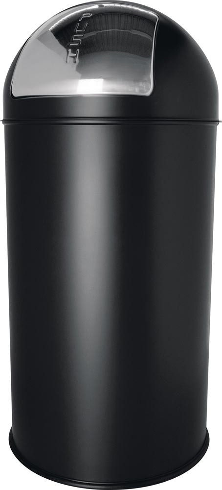 Rumpf und Haube aus pulverbeschichtetem Stahlblech oder Edelstahl · mit verzinktem Metall-Inneneimer · mit Push-Einwurfklappe · der Gummibodenring schützt Boden und Teppiche