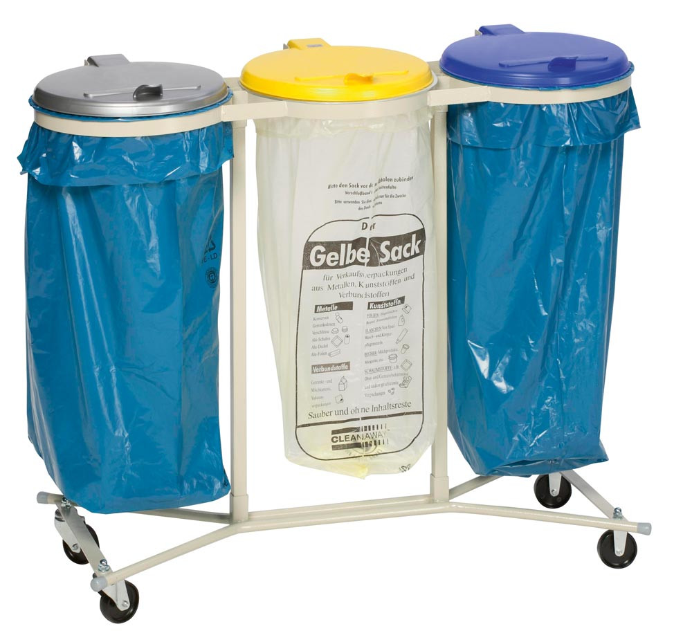 Abfallsammler, mit Rollen, 3-Fach, eisenglimmer,Deckel silber, gelb und blau aus Kunststoff, BxTxH 1069x440x960 mm