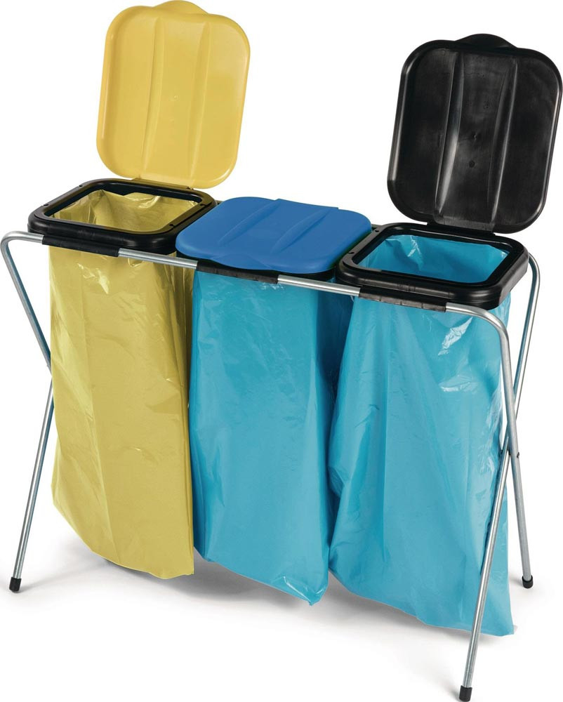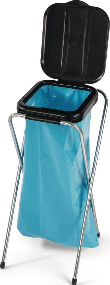 stationär oder fahrbar · für 20-130-l-Kunststoff- oder Papiersäcke · Stahlrohrgestell verzinkt · mit Klemmvorrichtung · Federdeckel oder Klappdeckel · blitzschnell aufgebaut · platzsparende Aufbewahrung