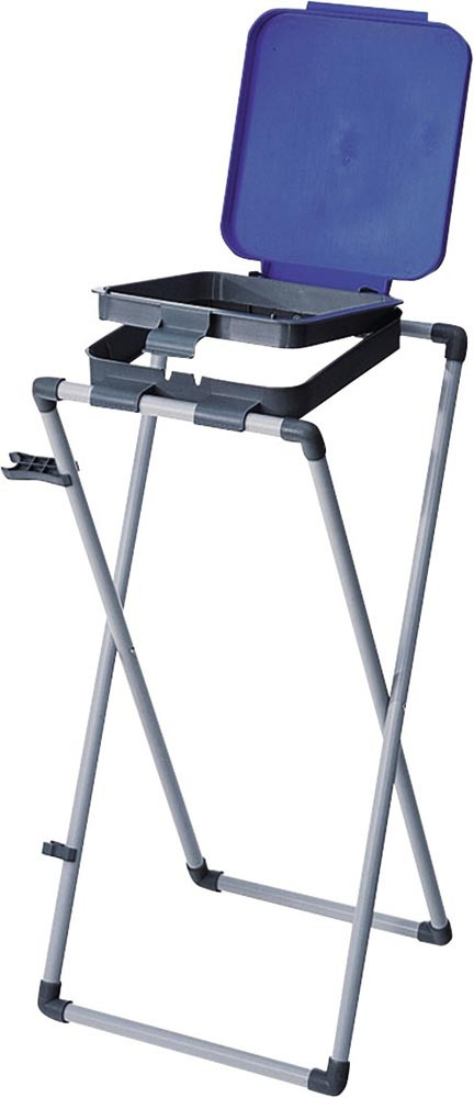 stabiles Leichtmetallrohr, grau · komplett mit Halterung, Einspannrahmen zum Einspannen von 60-/70-l-Säcken · blauer Klappdeckel · mit beiliegenden Verbindungsklemmen können mehrere Ständer zu einer Sammelstation verbunden werden
