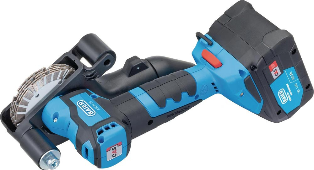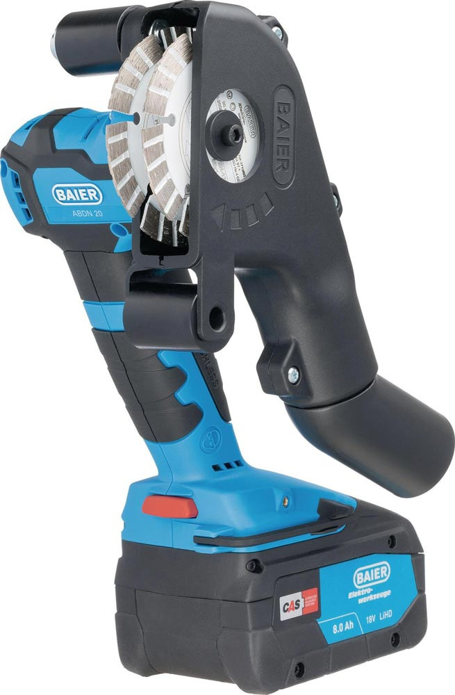 bürstenloser Motor mit optimaler Übersetzung für Mehrscheibentechnik um stegfrei zu Fräsen · Einsatz bei Ton (Dachziegel), Poroton und Verputz · innovative Kunststoffabsaugung · Überlastschutz und Spindelarretierung · ABDN 20 mit 2 Diamantscheiben zum Fräsen bis 22 mm Breite und 22 mm Tiefe