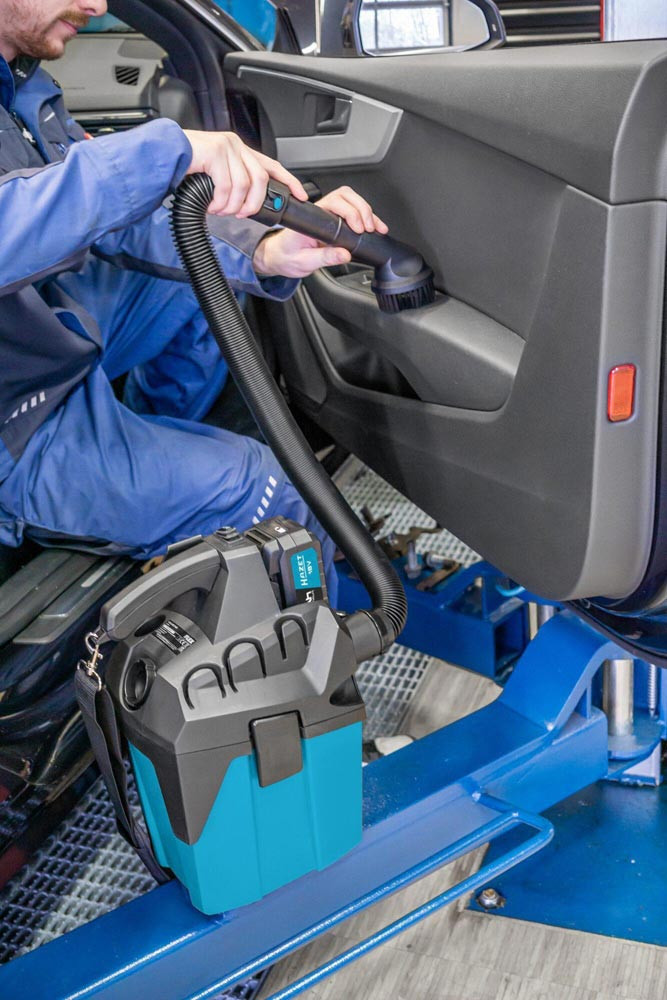 ein kompakter, leistungsstarker 18 V Sauger mit bis zu 12.000 Pa Unterdruck ∙ Tragegurt für mobilen Einsatz, Saugkraftregelung, LED-Akkuanzeige und manueller Filterabreinigung mit 3,0 l Behältervolumen ∙ 3.000 cm² Filterfläche und einem Schaldruckpegel von 70,7 dB(A) ∙ eignet sich ideal für den mobilen Einsatz ∙ der optionale Flexschlauch ist auf 2,5 m ausziehbar ∙ kompatibel mit allen 18 V Akkus der Hazet Serie 9500
