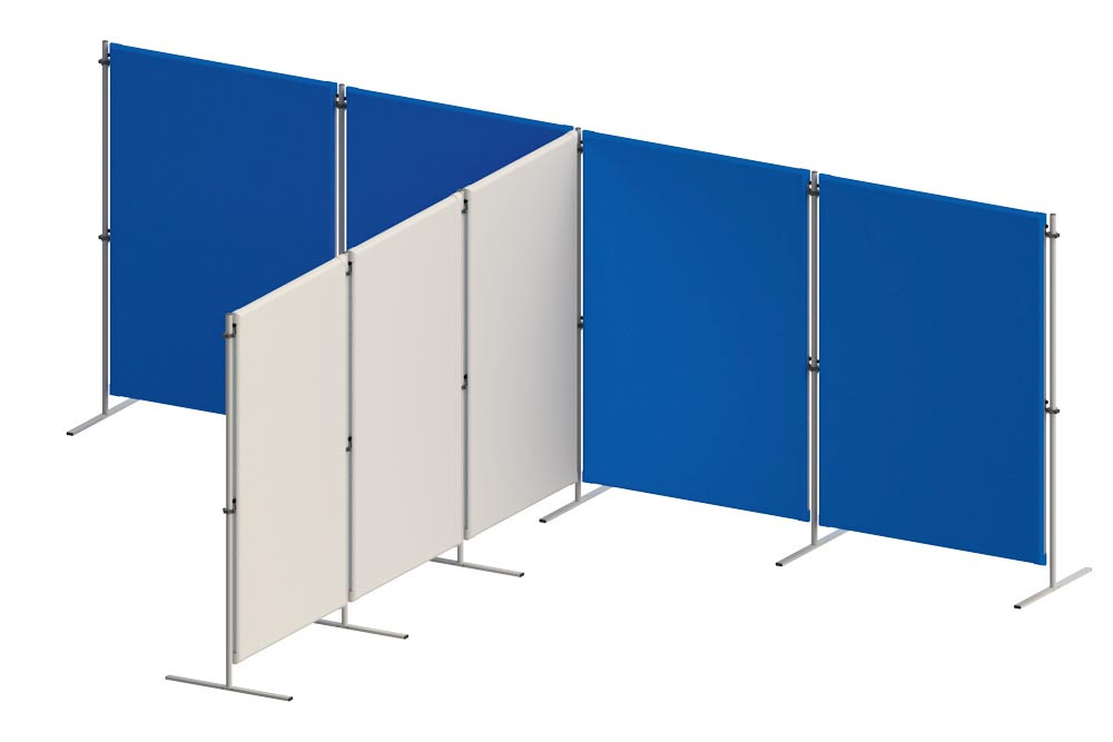 ∙ Geräuschdämmende und flexible Akustikwände ∙ Verkettbar und in jedem Winkel aufstellbar ∙ Einfacher Aufbau durch Verbindungsklammern zum Einstecken ∙ 50 mm starker Wandaufbau ∙ Mit abriebfesten Kuinstoffecken ∙ Anlieferung pro Element mit je einem Flachfuß, einem Fuß mit Stellschraube, sowie 2 Verbindungsklammern ∙ Leichter und minutenschneller Aufbau