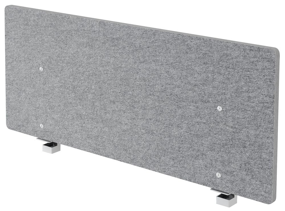 ∙ Schallschutzvlies grau meliert, Filzoptik, 25 mm dick ∙ Schwer entflammbar gemäß DIN 4102 (B1) ∙ Schallschutzklasse C ∙ Montage an der Hinterseite eines Schreibtisches ∙ Inklusive von 2 stabielen Halterungen zum Amklemmen an eine Schreibtischplatte ∙ Überstand nach hinten 20 mm