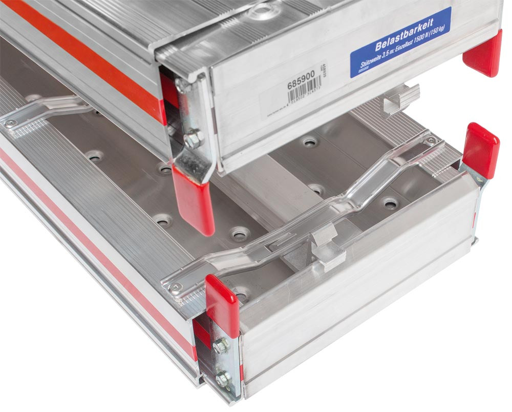 Platzsparendes Transportieren und Lagern ∙ Extrem hohe Stabilität für starke Beanspruchung ∙ Schnelle und einfache Verbindung der Einzelelemente ∙ Arretierbare Transportsicherung ∙ Beidseitig stufenlos ausziehbar und mittig teilbar