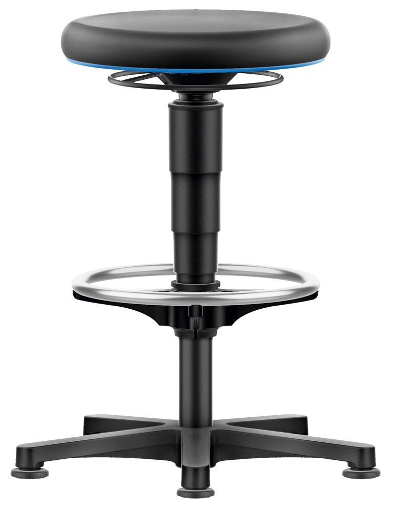 · Sehr großer Sitzhöhenverstellbereich · Höhenverstellung durch Ringauslösung · Fugenarm, leicht zu reinigen, desinfizierbar · Fußkreuz aus Kunststoff Ø 540 mm · Platzsparend und leicht mobil · Für Industrie, Dienstleistungen und Labor · Blauer Farbring zum Schutz der Polster