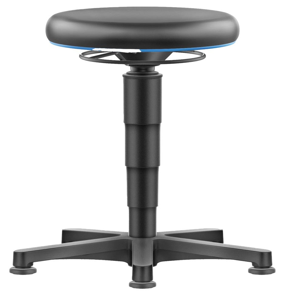 · Sehr großer Sitzhöhenverstellbereich · Höhenverstellung durch Ringauslösung · Fugenarm, leicht zu reinigen, desinfizierbar · Fußkreuz aus Kunststoff Ø 540 mm · Platzsparend und leicht mobil · Für Industrie, Dienstleistungen und Labor · Blauer Farbring zum Schutz der Polster