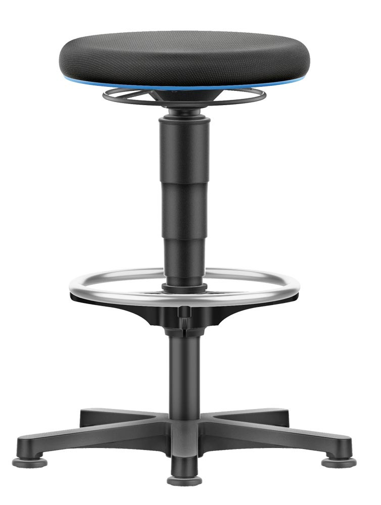 · Sehr großer Sitzhöhenverstellbereich · Höhenverstellung durch Ringauslösung · Fugenarm, leicht zu reinigen, desinfizierbar · Fußkreuz aus Kunststoff Ø 540 mm · Platzsparend und leicht mobil · Für Industrie, Dienstleistungen und Labor · Blauer Farbring zum Schutz der Polster