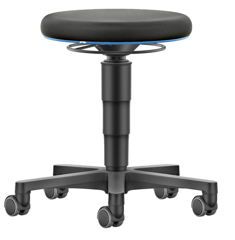 · Sehr großer Sitzhöhenverstellbereich · Höhenverstellung durch Ringauslösung · Fugenarm, leicht zu reinigen, desinfizierbar · Fußkreuz aus Kunststoff Ø 540 mm · Platzsparend und leicht mobil · Für Industrie, Dienstleistungen und Labor · Blauer Farbring zum Schutz der Polster