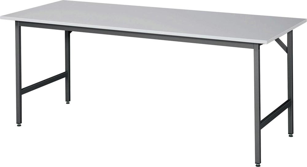 Untergestell aus Profilstahlrohr 30 x 30 mm mit integrierter Höhenverstellung · Querstreben oben (vorne und hinten) · Tragfähigkeit max. 300 kg bei gleichmäßig verteilter statischer Flächenlast · Melamin-Platte mit Melaminharz-Direktbeschichtung nach DIN 68765, bedingte Kratz- und Stoßfestigkeit · Stärke 22 mm · umweltfreundliche Pulverbeschichtung in anthrazitmetallic, ähnlich RAL 7016 · zerlegte Anlieferung, einfache Montage