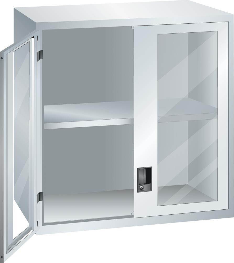 Aufsatzschrank mit Sichtfensterflügeltüren, BxTxH 1023x572x1000 mm, 1 Verstellboden, RAL 7035, passend zu Schubladenschrank 54x27 E EP531364