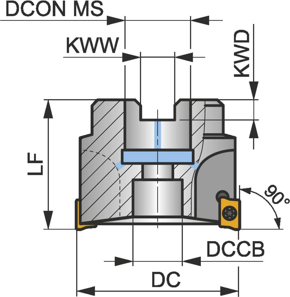 Eckfräser mit positiver/negativer Geometrie zum spannen von 7 Stück ADMX 1606.. oder ADEX 1606.. einseitigen Wendeschneidplatten · Schnittdurchmesser 80mm mit 90° Anstellwinkel und 27mm Verbindungsbohrung gemäß DIN 8030-A · 50mm Überstandslänge · Kühlkanalbohrung und ungleiche Teilung zum Kopierfräsen · flachen Schulterfräsen · flachen Nutfräsen · Rampen · Helikalen Fräsen · Tauchfräsen und progressiven Eintauchen mit einer maximalen Schnitttiefe von 13.0mm