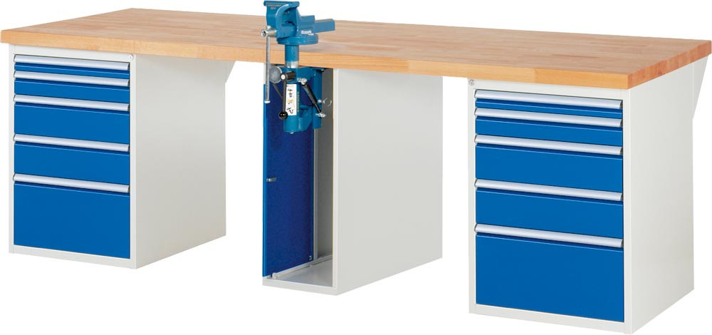 Baukastenwerkbank, BxTxH 2500x700x890 mm, Platte Buche , 2 Blocks, 1 Schraubstock, 10 Schubl. 2x60 mm, 2x90 mm, 4x150 mm, 2x270 mm, RAL 7035/5010 EP562605