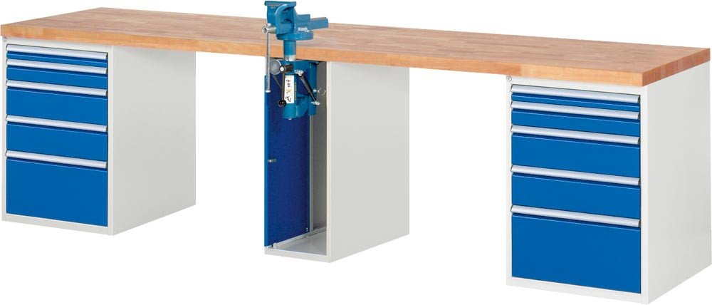 Baukastenwerkbank, BxTxH 2500x700x890 mm, Platte Buche , 2 Blocks, 1 Schraubstock, 10 Schubl. 2x60 mm, 2x90 mm, 4x150 mm, 2x270 mm, RAL 7035/5010 EP562605