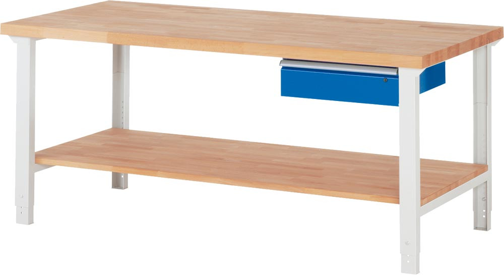 Baukastenwerkbank, Arbeitsplatte Buche massiv 40 mm, 1 Schublade 150 mm, BxTxH 2000x700x790-1140 mm, höhenverstellbar, Ablageboden T515 mm EP561137