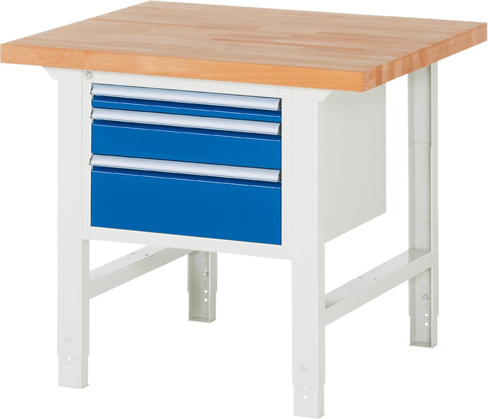 Baukastenwerkbank, Platte Buche 40 mm, 3 Schubladen: 1x60, 1x120, 1x180 mm, BxTxH 1000x900x790-1140 mm, RAL 7035/5010