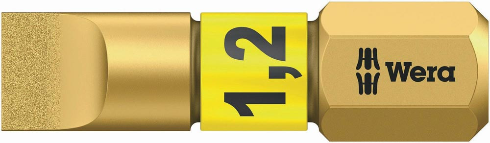 Bits für Schlitzschrauben mit winzigen Diamantpartikeln auf der Bitspitze. Diese sorgen für sicheren Sitz in der Schraube · reduzieren den benötigten Anpressdruck und reduzieren die Gefahr des Abrutschens. Mit Torsionszone · in die bei Belastungsspitzen kinetische Energie abgeleitet wird. Dadurch signifikante Erhöhung der Produktlebensdauer. 1/4″-Sechskant · passend für Halter nach DIN ISO 1173-D 6,3. Vorteile: Für Schlitzschrauben. Mit BiTorsion-Zone zur Abfederung von Belastungsspitzen. Erhebliche Verringerung der Bruchgefahr · deutliche Verlängerung der Lebensdauer. Diamantbeschichtung für sicheren Sitz in der Schraube. 1/4″ Sechskant-Antrieb (Wera Anschluss-Reihe 1). Mit Werkzeugfinder Take it easy: Farbkennzeichnung nach Profilen und Größenstempelung. Bits für Schlitzschrauben mit winzigen Diamantpartikeln auf der Bitspitze. Diese sorgen für sicheren Sitz in der Schraube · reduzieren den benötigten Anpressdruck und reduzieren die Gefahr des Abrutschens. Mit Torsionszone · in die bei Belastungsspitzen kinetische Energie abgeleitet wird. Dadurch signifikante Erhöhung der Produktlebensdauer. 1/4″-Sechskant · passend für Halter nach DIN ISO 1173-D 6,3.