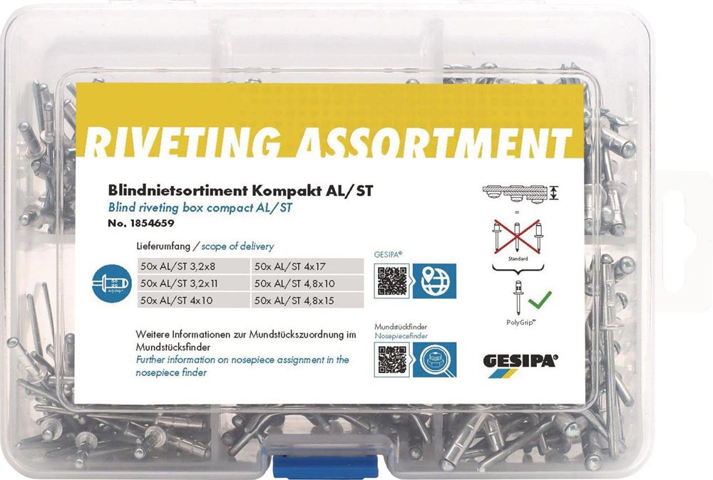 Lieferumfang: 50 x PolyGrip Alu/Stahl 3,2 x 8, 50 x PolyGrip Alu/Stahl 3,2 x 11, 50 x PolyGrip Alu/Stahl 4,0 x 10, 50 x PolyGrip Alu/Stahl 4,0 x 17, 50 x PolyGrip Alu/Stahl 4,8 x 10, 50 x PolyGrip Alu/Stahl 4,8 x 15