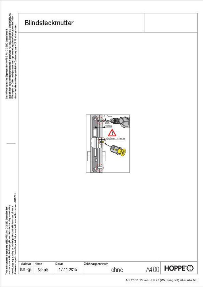 Eisen-Blindsteckmutter M5: für die Befestigung der (E)44er- · (E/K/M)55er-HOPPE-Schmalrosetten (außer Klebe- und Schieberosetten) an Aluminium-Profiltüren · Inhalt: 50 St.