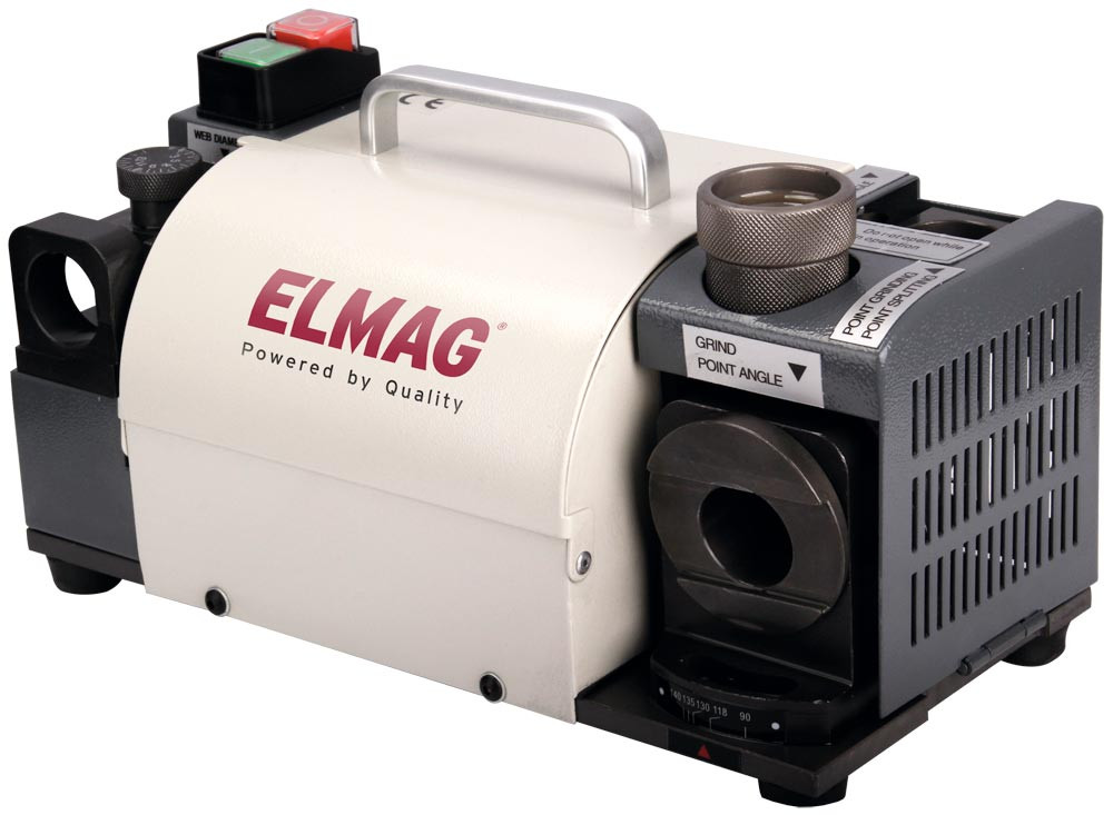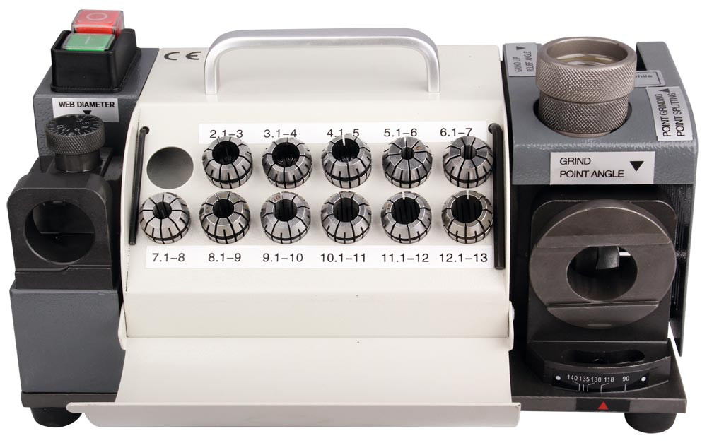 Standfeste Spiralbohrer-Schleifmaschine für den Handwerker ∙ Zum Schleifen von HSS- u. Hartmetall-Spiralbohrern ∙ Einfache Bohrerpositionierung ∙ Integrierte Schleifstationen zum Schleifen von Spitzenwinkels, des Freiwinkels und zur Kreuzanschliff-Bearbeitung ∙ Spitzenwinkel 90°-135°