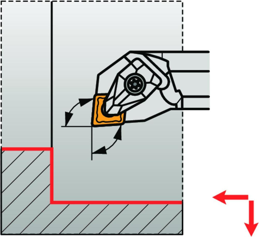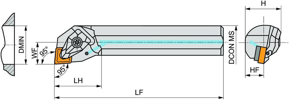 Dreh-Bohrstange doppelt geklemmt zum spannen von 80° Rhombus negative Wendeschneidplatten mit einem Innenkreisdurchmesser von 9.525mm · 3.18mm Dick (ISO Bezeichnung CN.. 0903.. ) · rechte Ausführung zum 95° Stirn-und Längsdrehen mit abgesetzem Schaft · Stahl mit Kühlkanalbohrung · 25mm Durchmesser x 300mm Länge für Innenkegeldrehen und Längsdrehen mit und ohne Schulter