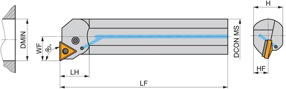 Dreh-Bohrstange mit Kniehebelklemmung zum spannen von Triangular negative Wendeschneidplatten mit einem Innenkreisdurchmesser von 9.525mm · 4.76mm Dick (ISO Bezeichnung TN.. 1604.. ) · rechte Ausführung zum 90° Längsdrehen mit abgesetzem Schaft · Stahl mit Kühlkanalbohrung · 32mm Durchmesser x 250mm Länge für Innenkegeldrehen und Längsdrehen ohne Schulter