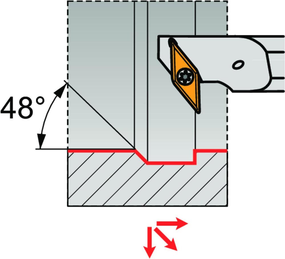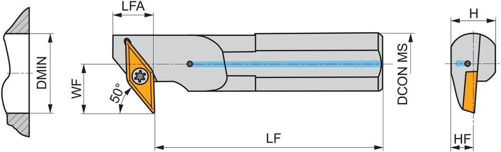 Dreh-Bohrstange mit Schraubklemmung zum spannen von 35° Rhombus positive Wendeschneidplatten mit einem Innenkreisdurchmesser von 7.94mm · 3.18mm Dick (ISO Bezeichnung VC.. 1303.. ) · linke Ausführung zum 95° Stirn-und Längsdrehen mit abgesetzem Schaft · Stahl mit Kühlkanalbohrung · 32mm Durchmesser x 300mm Länge für Rückwärtsentgraten