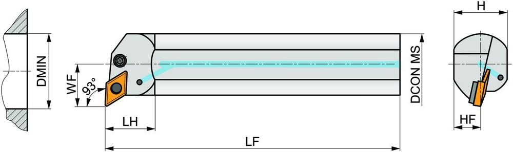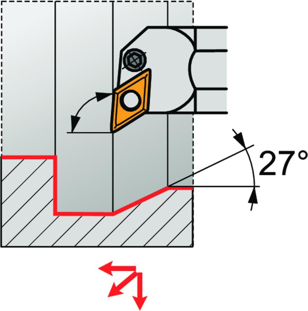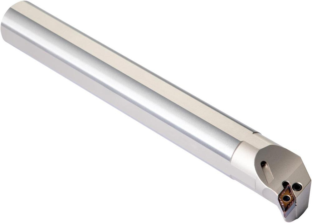Dreh-Bohrstange mit Kniehebelklemmung zum spannen von 55° Rhombus negative Wendeschneidplatten mit einem Innenkreisdurchmesser von 15.875mm · 6.35mm Dick (ISO Bezeichnung DN.. 1506.. ) · linke Ausführung zum 93° Längsdrehen mit abgesetzem Schaft · Stahl mit Kühlkanalbohrung · 40mm Durchmesser x 300mm Länge für Innenkegeldrehen · Kopierdrehen in einer und mehreren Richtungen und Längsdrehen mit und ohne Schulter