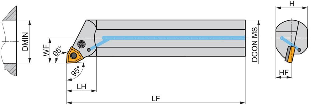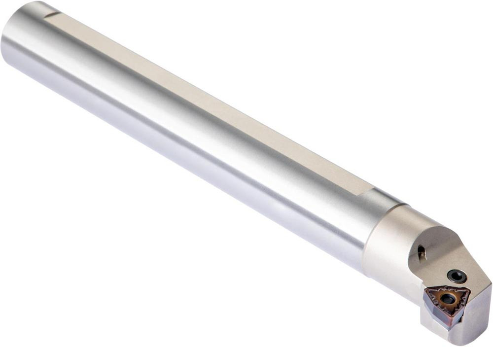 Dreh-Bohrstange mit Kniehebelklemmung zum spannen von 80° Trigonal negative Wendeschneidplatten mit einem Innenkreisdurchmesser von 12.7mm · 4.76mm Dick (ISO Bezeichnung WN.. 0804.. ) · rechte Ausführung zum 95° Stirn-und Längsdrehen mit abgesetzem Schaft · Stahl mit Kühlkanalbohrung · 50mm Durchmesser x 350mm Länge für Innenkegeldrehen und Längsdrehen mit und ohne Schulter