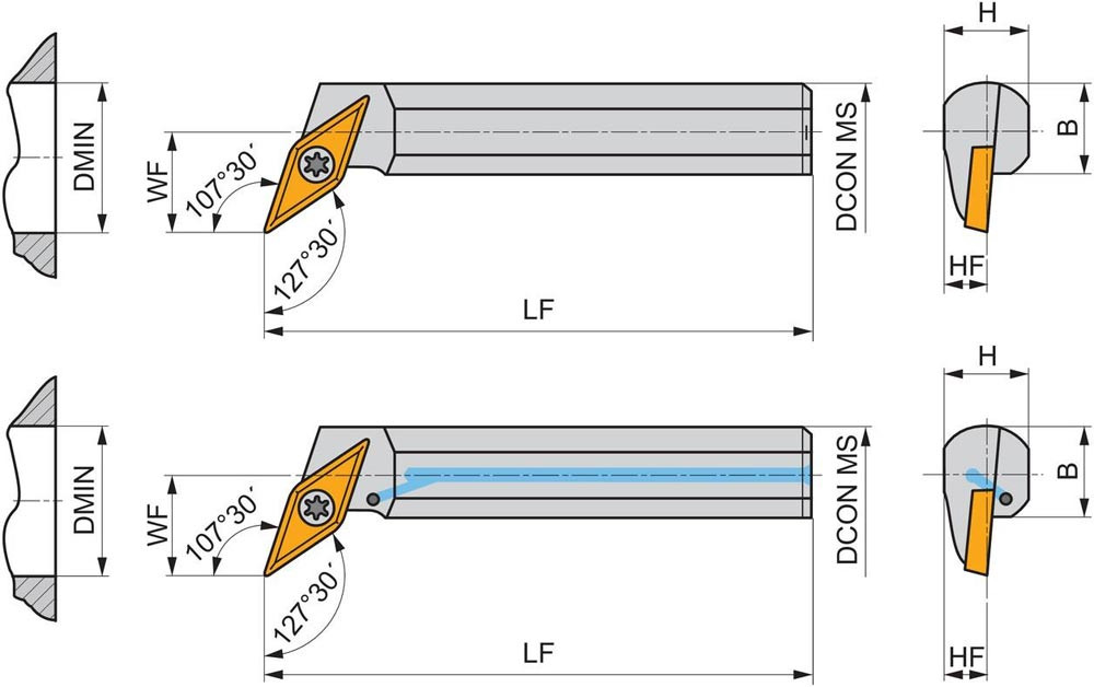 Dreh-Bohrstange mit Schraubklemmung zum spannen von 35° Rhombus positive Wendeschneidplatten mit einem Innenkreisdurchmesser von 9.525mm · 4.76mm Dick (ISO Bezeichnung VB.. 1604.. oder VC.. 1604.. ) · rechte Ausführung zum 107°30' Längsdrehen mit abgesetzem Schaft · Stahl ohne Kühlkanalbohrung · 40mm Durchmesser x 400mm Länge für Kopierdrehen in einer und mehreren Richtungen