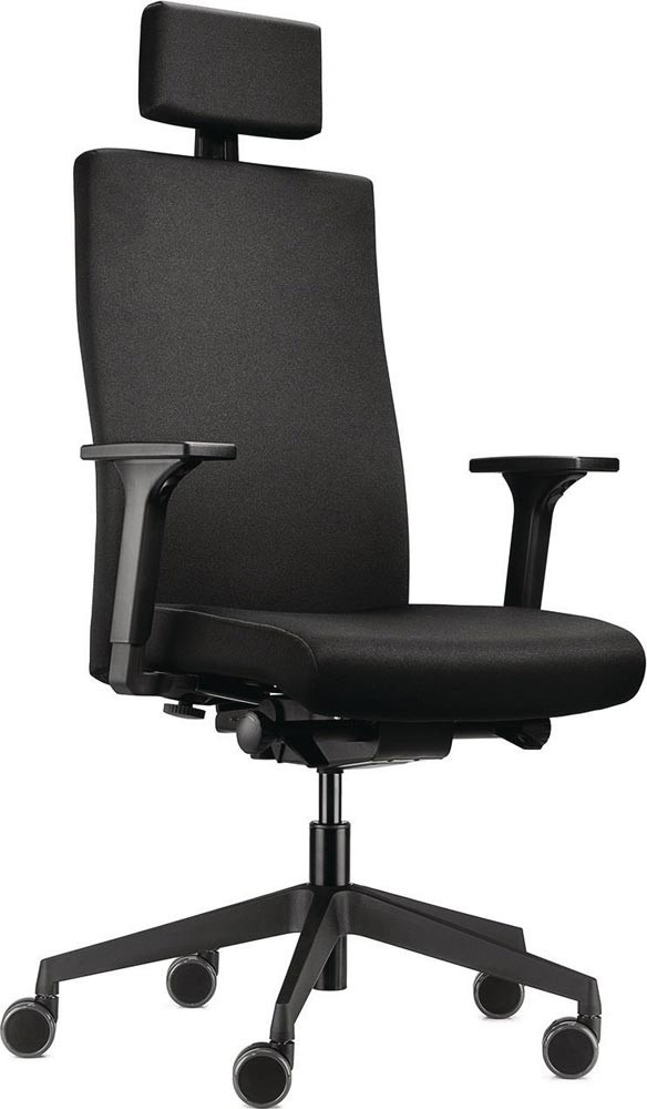 mit Synchrontechnik (mit Armlehnen) · für überwiegend sitzende Tätigkeiten · stabiles Kunststofffußkreuz, schwarz · seitliche Einstellung des Rückenlehnengegendrucks im Sitzen mittels Handrad · stufenlose Sitzhöhenverstellung · hohe Vollpolster-Rückenlehne, höhenverstellbar · Rückenlehne mit integrierter Lumbalstütze · ergonomisch geformter Sitz · mit höhenverstellbarer Nackenstütze ∙ Armlehnen höhen-/breiten und tiefenverstellbar mit PU-Soft-Auflagen, schwenkbar · Sitztiefenverstellung 50 mm mittels Schiebesitz · Bezug 100 % Polyester · Sitzfläche B 510 x T 400-450 mm · Lehnenhöhe 740-880 mm · Universalrollen für weiche und harte Böden · Lieferung erfolgt zerlegt