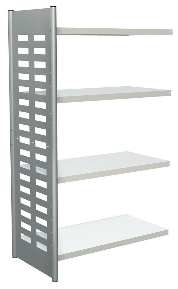 · Seitenrahmen aus Rundrohr Ø 40 mm mit verschweißten Seitenblechen, pulverbeschichtet in alusilber ähnl. RAL 9006 · Fachböden in RAL 7035 lichtgrau, mit Sicherheitskantung 40 mm hoch und höhenverstellbar im Raster von 86 mm