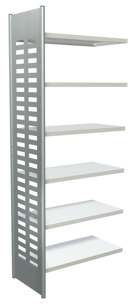 · Seitenrahmen aus Rundrohr Ø 40 mm mit verschweißten Seitenblechen, pulverbeschichtet in alusilber ähnl. RAL 9006 · Fachböden in RAL 7035 lichtgrau, mit Sicherheitskantung 40 mm hoch und höhenverstellbar im Raster von 86 mm