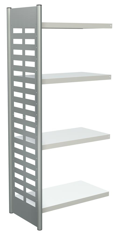 · Seitenrahmen aus Rundrohr Ø 40 mm mit verschweißten Seitenblechen, pulverbeschichtet in alusilber ähnl. RAL 9006 · Fachböden in RAL 7035 lichtgrau, mit Sicherheitskantung 40 mm hoch und höhenverstellbar im Raster von 86 mm