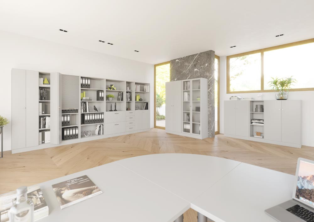 ∙ Beidseitig melaminharzbeschichtete Oberflächen, blend- und reflexarm, abriebfest und pflegeleicht ∙ Von oben verstellbare Sockelfüße zum Ausgleich von Bodenunebenheiten