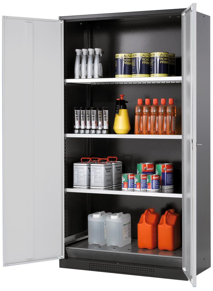 ∙ Korpus aus Feinstahlblech mit robuster, hochwertiger Strukturlackierung in RAL 7016 anthrazitgrau ∙ Türen abschließbar mit einem im Drehgriff integrierten Zylinderschloss ∙ Stellfüße mit der Möglichkeit die Bodenunebenheiten auszugleichen ∙ Natürliche Eigenbelüftung über im Boden befindliche Luftöffnungen ∙ Inklusive 1 Bodenauffangwanne gem. StawaR mit Lochblecheinsatz als erste Lagerebene