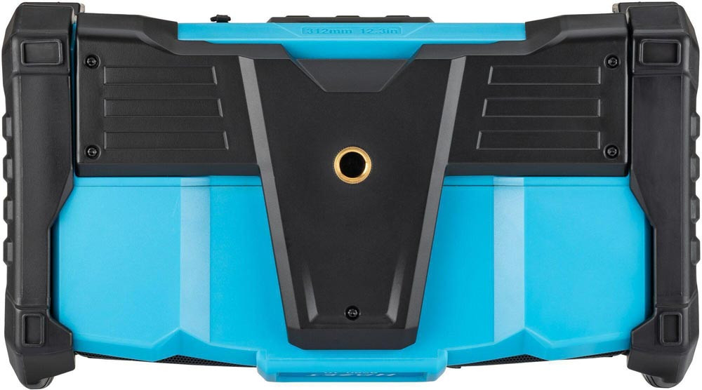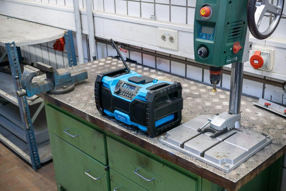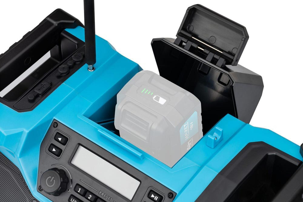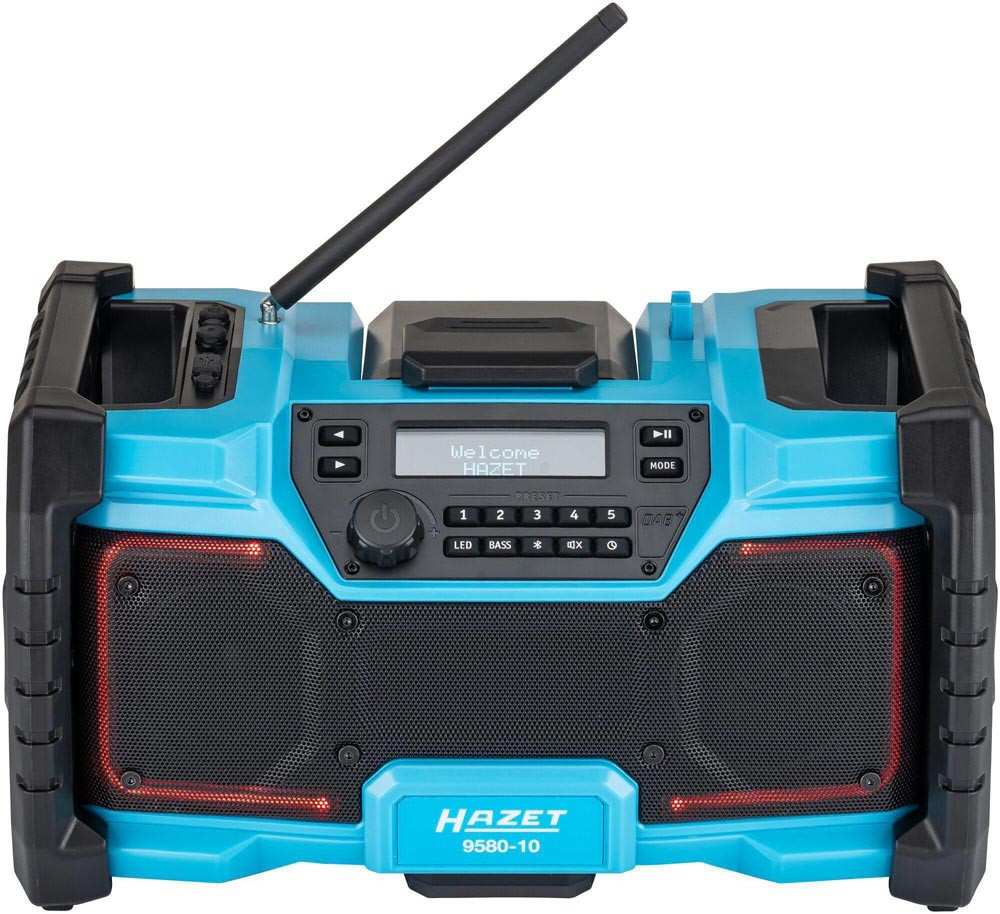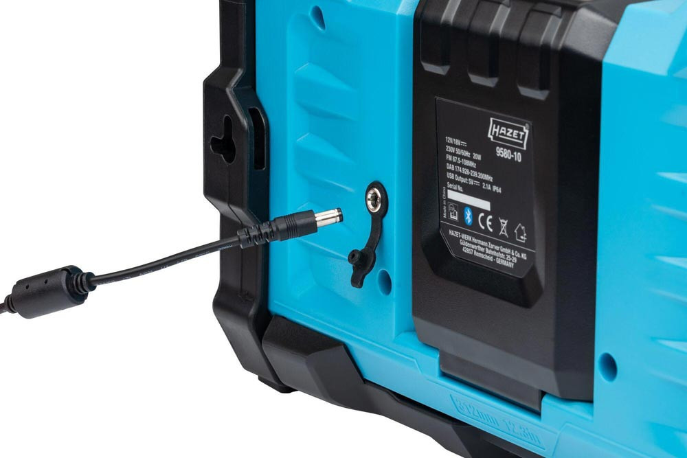 Bluetooth ∙ Hybrid 18 Volt und 230 Volt · mit Netzteil · robustes Radio für Empfang von DAB+ (174,928 – 239,200 MHz) und FM (87,5 – 108 MHz) · Lautsprecherleistung 2x 10 Watt und Bass-Boost für Top Klangqualität · beleuchtetes LCD Display ∙ farbiger LED Leuchtstreifen ∙ Digitaluhr ∙ einklappbare flexible Antenne · Bluetooth® ∙ Aux-Eingang ∙ USB-Anschluss ∙ Lademöglichkeit für Smartphones, Tablets · automatische Sendersuche und 5 Programmspeicherplätze · Mute Funktion · LED-Akku Kapazitätsanzeige am Akku Pack · kompatibel mit allen 18 Volt Akku Packs der Serie 9500 · Maße: 369 mm x 212 mm x 201 mm