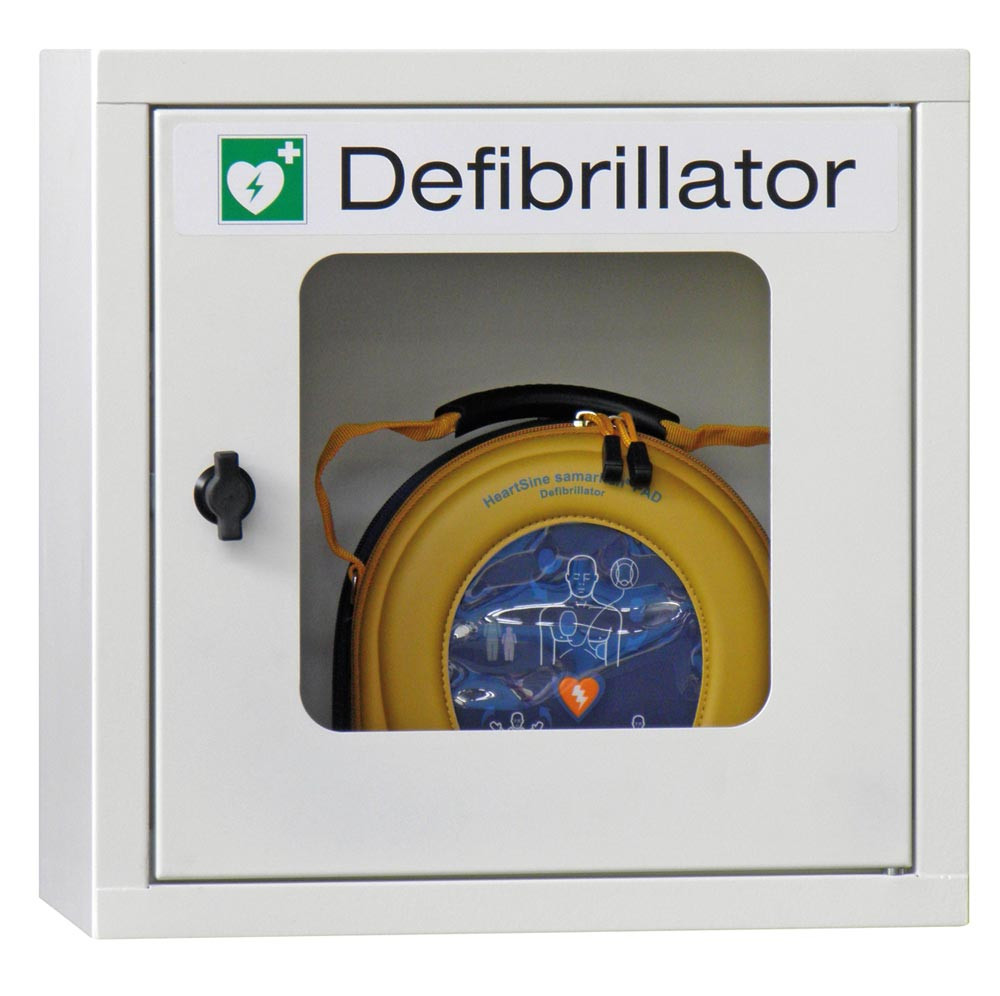 · Stabile Stahlblechkonstruktion · Oberfläche pulverbeschichtet · 3 Ausführungen erhältlich · Tür mit Sichtfenster und Kennzeichnung " Defibrillator " (Aufkleber) · Mit Drehverschluss · Sichtfenster aus bruchsicherem Acrylglas