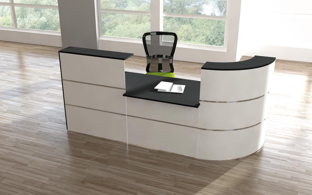∙ Stahl-/Holzkonstruktion ∙ Thekenkörper aus Metall in weiß mit dekorativen Edelstahlstreifen ∙ Melaminharzbeschichtete Holzplatten mit ABS-Kante in anthrazit ∙ Kabeldurchlässe in der Arbeitsplatte ∙ Hinter den 1100 mm hohen Fronten befindet sich ein vollwertiger Arbeitsplatz mit einer Tiefe von 800 mm und einer Höhe von 740 mm ∙ Beliebig erweiterbar durch Anbauelement