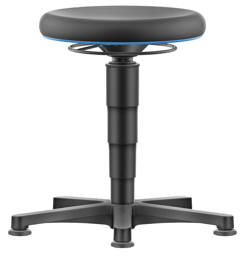 · Sehr großer Sitzhöhenverstellbereich · Höhenverstellung durch Ringauslösung · Fugenarm, leicht zu reinigen, desinfizierbar · Fußkreuz aus Kunststoff Ø 540 mm · Platzsparend und leicht mobil · Für Industrie, Dienstleistungen und Labor · Blauer Farbring zum Schutz der Polster