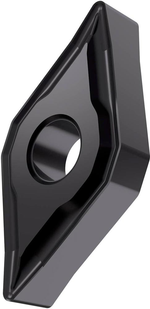 Doppelseitige negative Drehwendeschneidplatte · 55° Rhombisch mit Innenkreisdurchmesser von 9.525mm · 4.76mm Dick · 0.4mm Radius · Indexgenauigkeit nach ISO-Toleranzklasse-M · Spanbrecher NF mit verrundeter Schneidkante · im Substrat T6310 · PVD beschichtet WC-Co Feinstkornsubstrat in den ISO-Bereichen P01 -P15 und M01 -M15 · zum schlichten bis medium bearbeiten von Stählen und nichtrostenden Stählen