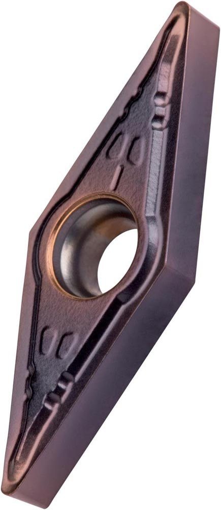 Einseitige positive Drehwendeschneidplatte · 35° Rhombisch mit 5° Freiwinkel · Innenkreisdurchmesser von 9.525mm · 4.76mm Dick · 0.4mm Radius · Indexgenauigkeit nach ISO-Toleranzklasse-M · Spanbrecher FM mit verrundeter Schneidkante · im Substrat T8315 · PVD beschichtet WC-Co Feinkornsubstrat im ISO-Bereich M05 -M20 · zum schlichten bis medium bearbeiten von nichtrostenden Stählen