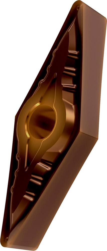 Doppelseitige negative Drehwendeschneidplatte · 35° Rhombisch mit Innenkreisdurchmesser von 9.525mm · 4.76mm Dick · 0.8mm Radius · Indexgenauigkeit nach ISO-Toleranzklasse-M · Spanbrecher SF mit verrundeter Schneidkante · im Substrat T8430 · PVD beschichtet WC-Co Feinkornsubstrat in den ISO-Bereichen P20 -P40 und M20 -M35 · zum schlichten bis medium bearbeiten von Stählen und nichtrostenden Stählen