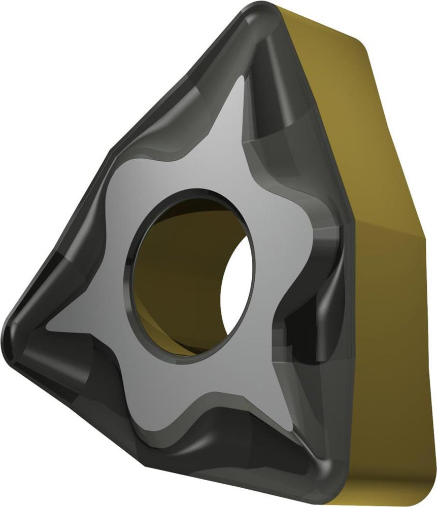 Doppelseitige negative Drehwendeschneidplatte · 80° Trigon mit Innenkreisdurchmesser von 12.7mm · 4.76mm Dick · 1.2mm Radius · Indexgenauigkeit nach ISO-Toleranzklasse-M · Spanbrecher NF mit verrundeter Schneidkante · im Substrat T9415 · MT-CVD beschichtet WC-Co Substrat im ISO-Bereich P05 -P30 · zum schlichten bis medium bearbeiten von Stählen