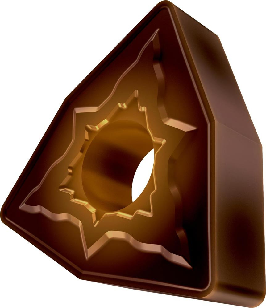 Doppelseitige negative Drehwendeschneidplatte · 80° Trigon mit Innenkreisdurchmesser von 12.7mm · 4.76mm Dick · 1.2mm Radius · Indexgenauigkeit nach ISO-Toleranzklasse-M · Spanbrecher NMR mit verrundeter Schneidkante · im Substrat T8430 · PVD beschichtet WC-Co Feinkornsubstrat in den ISO-Bereichen P20 -P40 und M20 -M35 · zum schlichten bis schruppen bearbeiten von Stählen und nichtrostenden Stählen