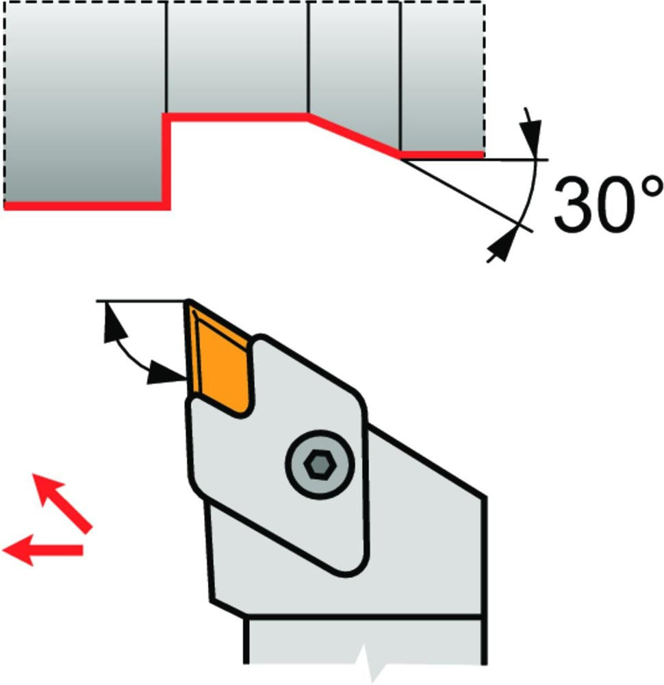 Dreh-Trägerwerkzeug von oben geklemmt zum spannen von 55° Parallelogramm negative Wendeschneidplatten mit einem Innenkreisdurchmesser von 9.525mm · 4.76mm Dick (ISO Bezeichnung KN.X 1604…R ) · rechte Ausführung zum 93° Stirndrehen mit abgesetzem Schaft · 25mm Werkzeughöhe x 25mm Breite x 150mm Länge für entgraten · Kegeldrehen · Kopierdrehen in einer und mehreren Richtungen und Längsdrehen mit und ohne Schulter
