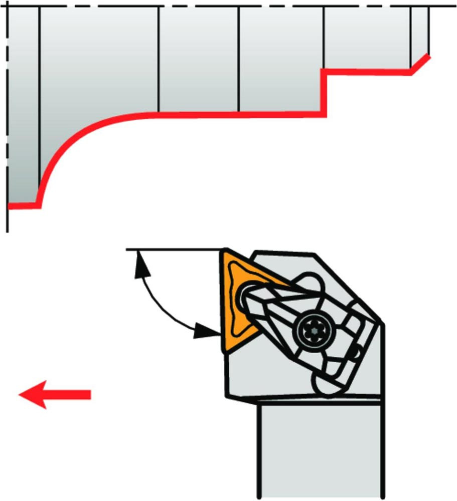 Dreh-Trägerwerkzeug doppelt geklemmt zum spannen von Triangular negative Wendeschneidplatten mit einem Innenkreisdurchmesser von 9.525mm · 4.76mm Dick (ISO Bezeichnung TN.. 1604.. ) · rechte Ausführung zum 90° Stirndrehen mit abgesetzem Schaft · 25mm Werkzeughöhe x 25mm Breite x 150mm Länge für Kegeldrehen und Längsdrehen mit und ohne Schulter